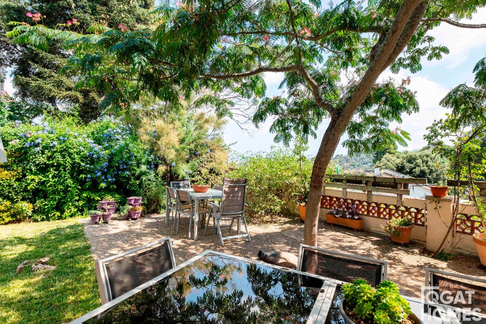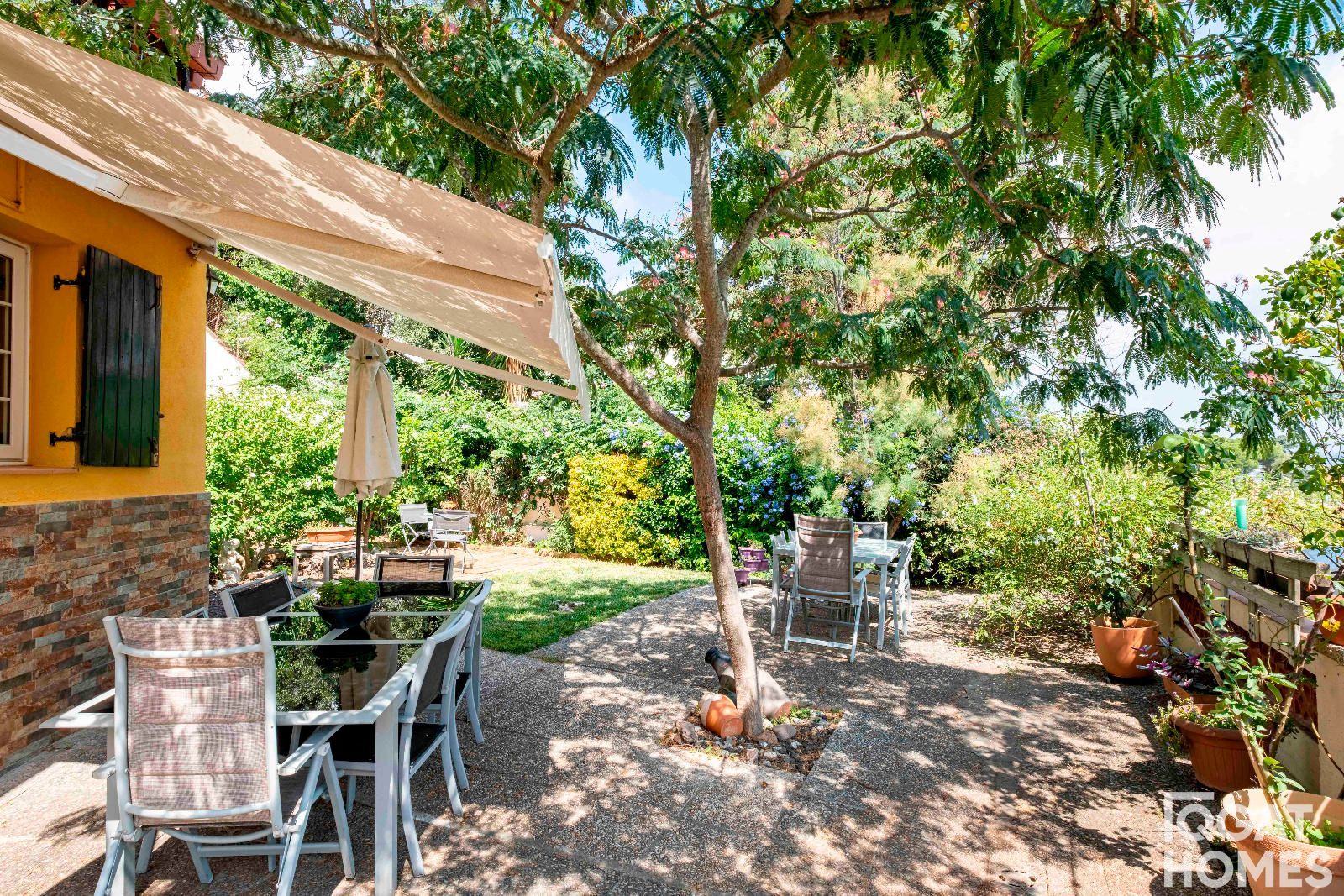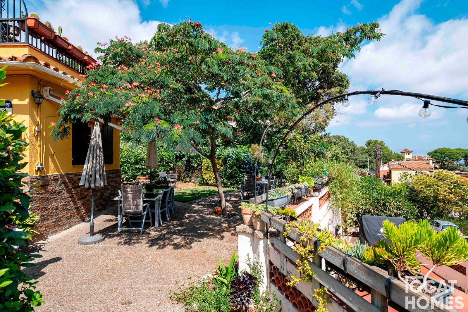 El jardín, distribuido en tres niveles, está bien cuidado y consolidado, con dos toldos, dos espacios de huerto y un amplio espacio cubierto para tender la ropa. También encontramos dos casetas: una de madera para trastero y otra de resina para herramientas de jardín.