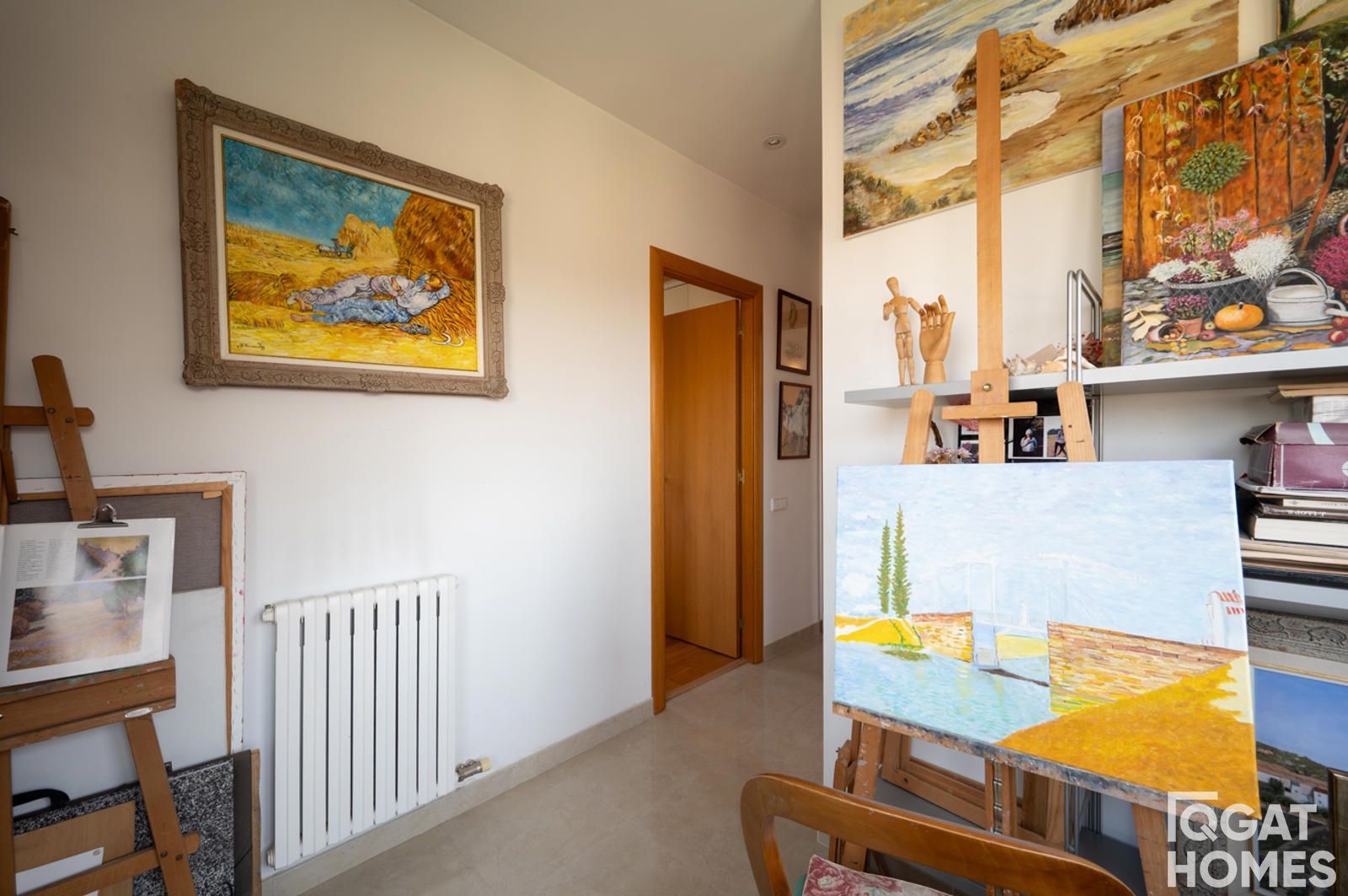 En la primera planta se ubica la zona de noche, donde destaca el amplio dormitorio principal con baño completo y un espacioso vestidor, actualmente habilitado como zona de trabajo. En esta planta también encontramos un dormitorio doble tipo suite con buenas vistas y un dormitorio individual, actualmente utilizado como estudio de pintura.